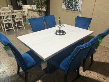 The Francesca dining table features a simple, elegant and immediately familiar look that blends with any style. This table showcases a gorgeous marble top with, contrasted with ebony black wood legs. This is a clean, modern table, generously proportioned for gathering friends and family.