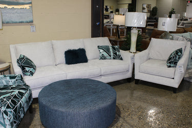 With its sloping, slightly flared arms and tapered wood feet, the Margaret offers a chic, contemporary focal point with just a hint of retro, by Jonathan Louis. Come into the store to see fabric options available for special order!