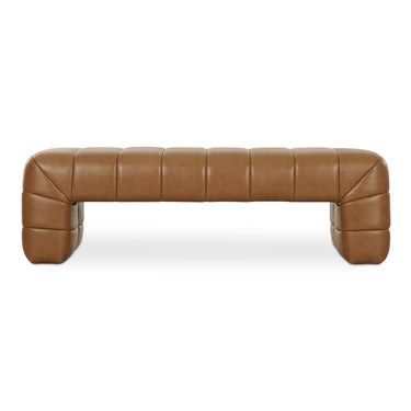 The Verity bench features a plump form enveloped in warm tan top-grain leather upholstery with warm tones for a touch of elegance. Wide channel detailing adds texture and visual interest, complemented by rich, warm tones that tell a story of comfort and coziness as the high-density foam seat provides a plush seating experience.