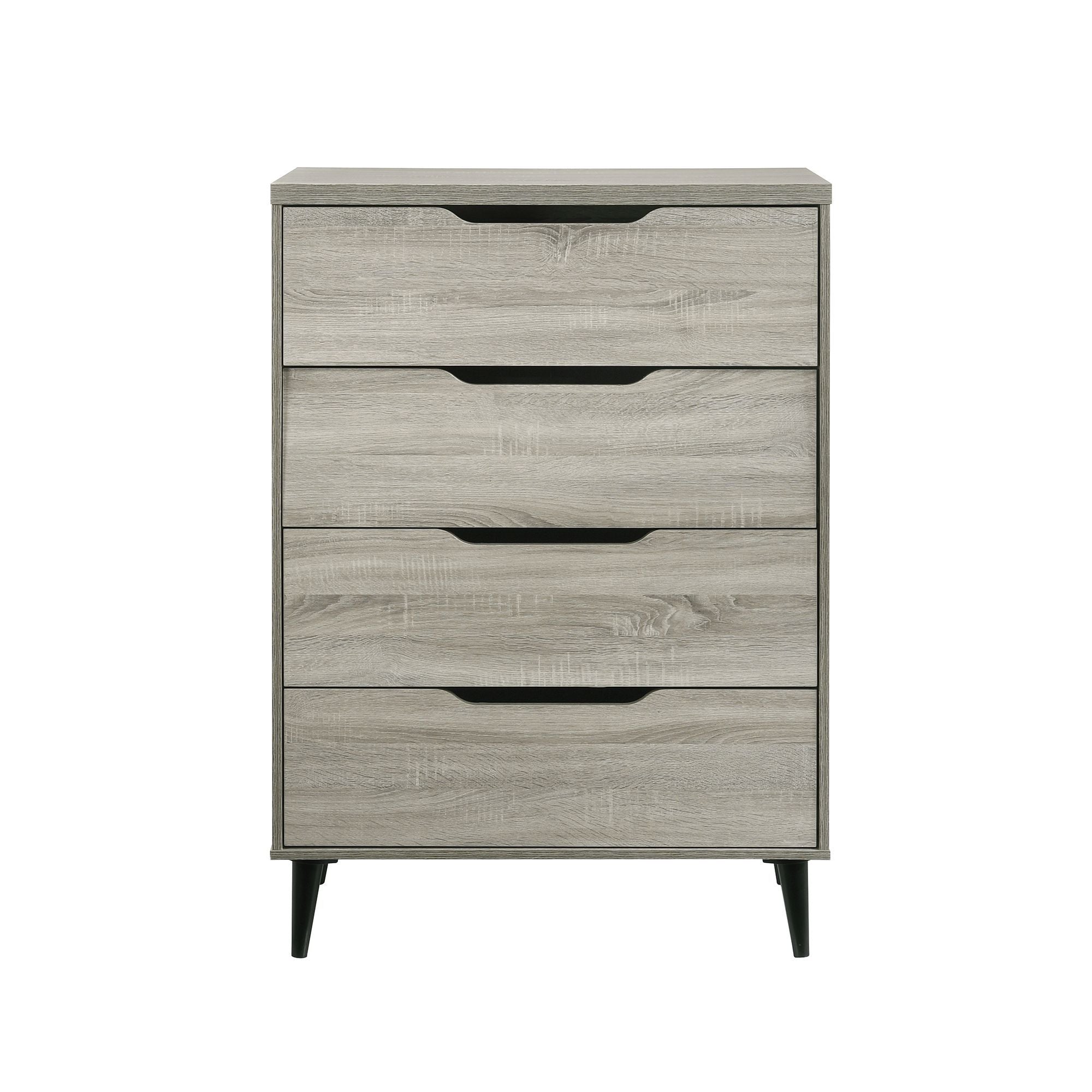 Enhance your bedroom with the sleek and modern Ernesto Chest, designed to offer both style and functionality. Featuring four spacious drawers, this chest provides ample storage for all your essentials. The unique cutout drawer handles add a contemporary touch, while the rich espresso finish showcases beautiful wood grain detailing. Supported by angled legs, the Ernesto Chest offers a stable and stylish base that complements any room. With interlock drawers for added durability, this piece effortlessly combines modern aesthetics with practical design, making it a perfect addition to your home.