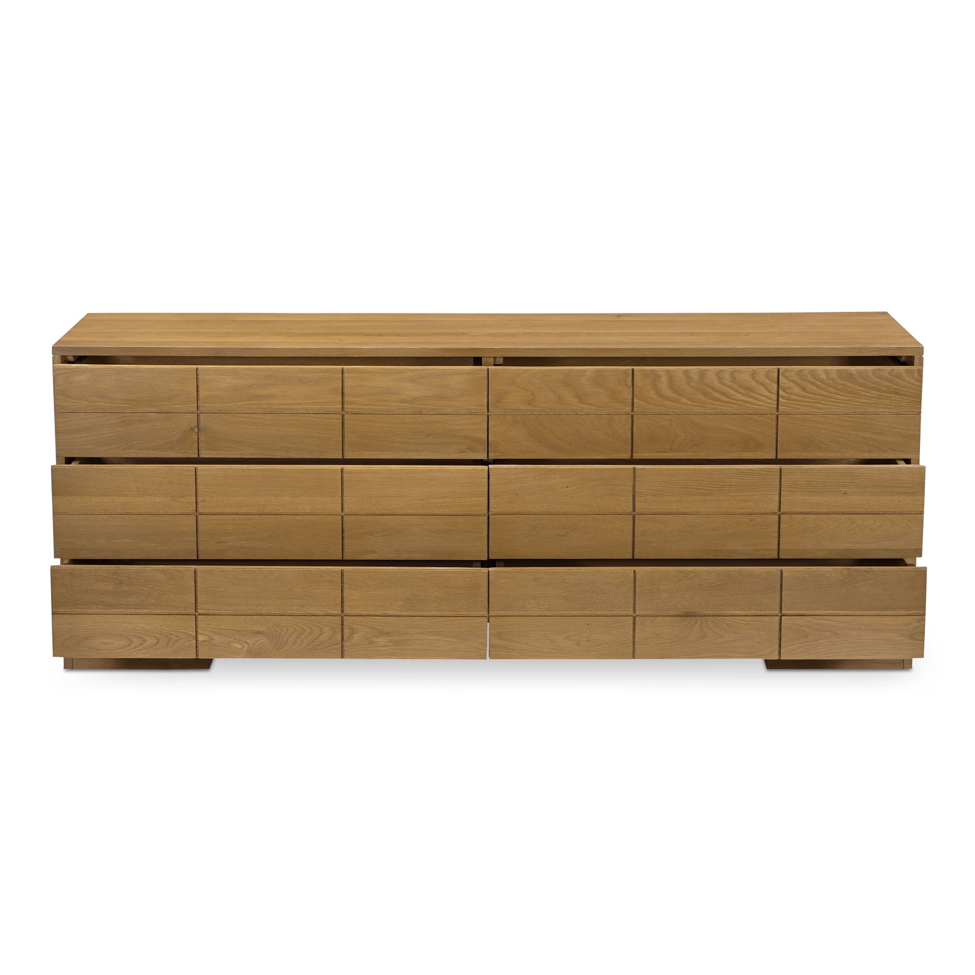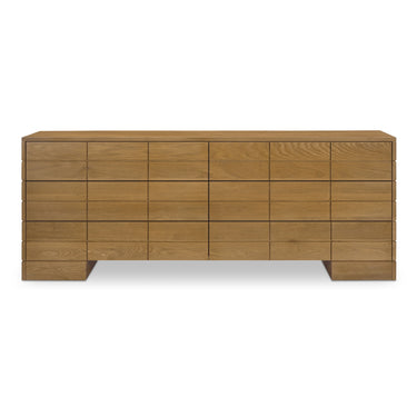 The Gia 6-drawer dresser's striking geometry brings out the oak wood's mid-tone brown finish to blend seamlessly into various interiors with its subtle sophistication. This piece features a unique arrangement with uniform drawers of all the same size, all maintaining a light, unbulky feel.