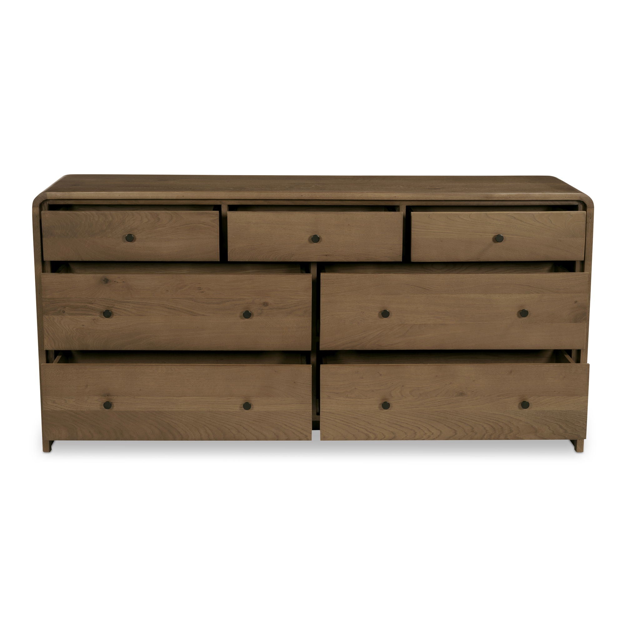 Featuring a unique waterfall edge and overhang detailing, the Riley 7-drawer dresser offers captivating visual interest, underscored by its solid oak construction. The seamless design is a timeless blend of sophistication and practicality, with ample seven-drawer storage.