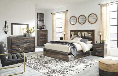 When merged in just the right way, rustic and industrial styles can make one happy marriage. Case in point: this bookcase bedroom group with storage. A refined take on barn board beauty, its complex, replicated wood grain. Three open cubbies lined with a dimming LED light strip keep bedtime reads top of mind. Underneath the bed: four smooth-gliding drawers and four open cubbies that accommodate casually cool storage bins.