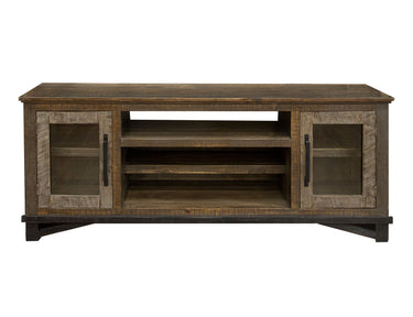 2 Door TV Stand for Wall Unit. The Loft Brown Collection is constructed using pine wood that has been hand-stained and distressed, complemented by hand-forged iron hardware. This beautiful collection features a wide range of high and low finish colors, making it a striking addition to any room décor you choose to design.