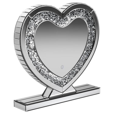 This heart-shaped table mirror blends glam style with practical lighting, perfect for vanities or dressing areas. The mirrored frame features an inset of faceted acrylic crystal inlay that catches light beautifully, while integrated LED illumination adds clarity for grooming or makeup application. Its freestanding design and decorative shape make it as functional as it is eye-catching, ideal for bedroom surfaces or beauty stations.