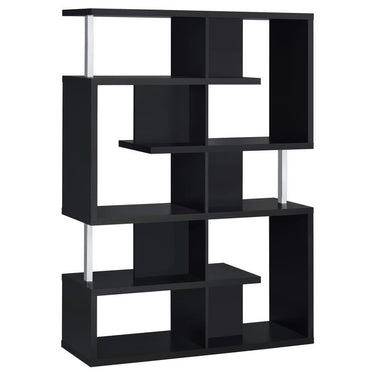 Add an artsy element to a library, living room, or home office. This five-tier double bookcase makes a bold statement with its funky, modern silhouette. Its shelves are arranged in a striking, geometric design for an updated look. This bookcase is crafted from steel, particle board, and engineered veneer for sturdy durability. Whether you choose a black or white finish, its gleaming chrome details pull it together in style.