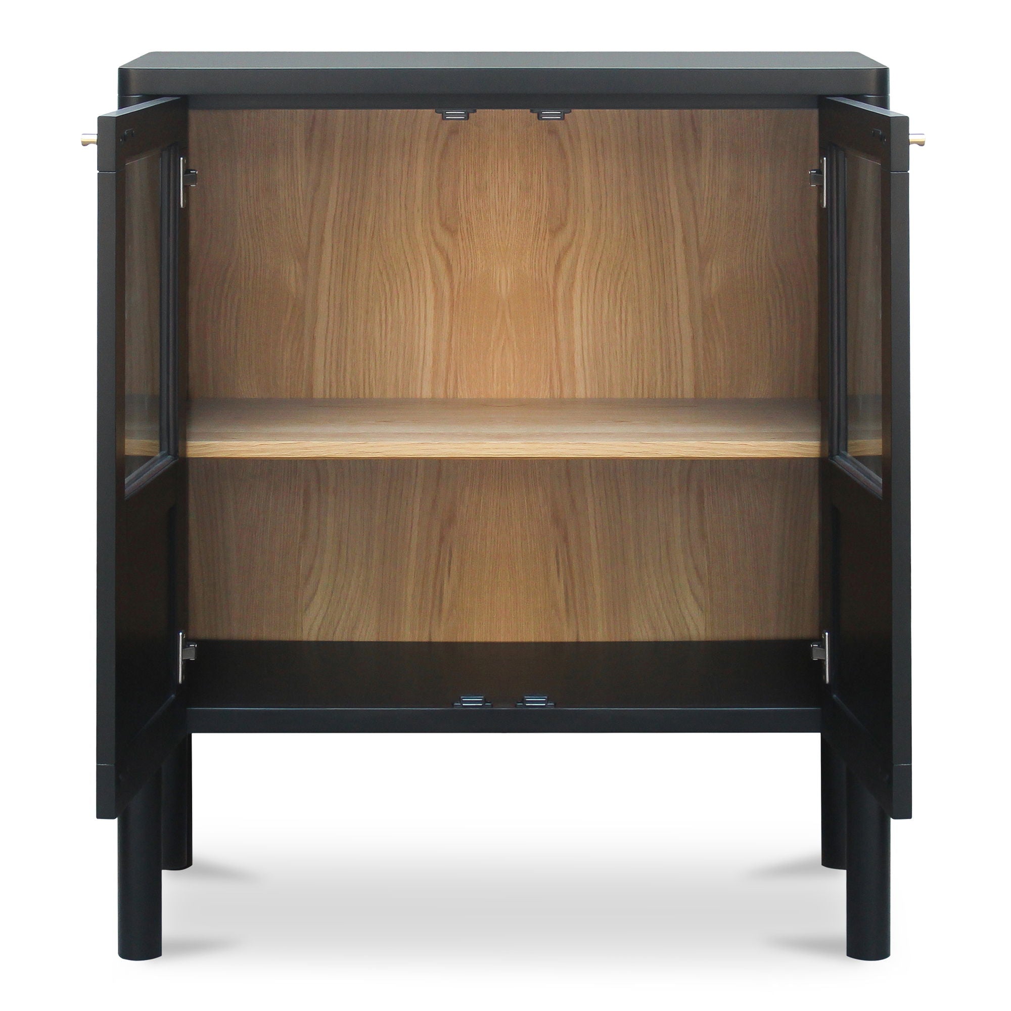 Thoughtfully designed, the Hannah cabinet balances transparency and concealment with tempered glass inserts. Crafted from solid pine frame and dowel legs with understated bronze hardware add a subtle softness, while the versatile finish complements diverse interior styles.