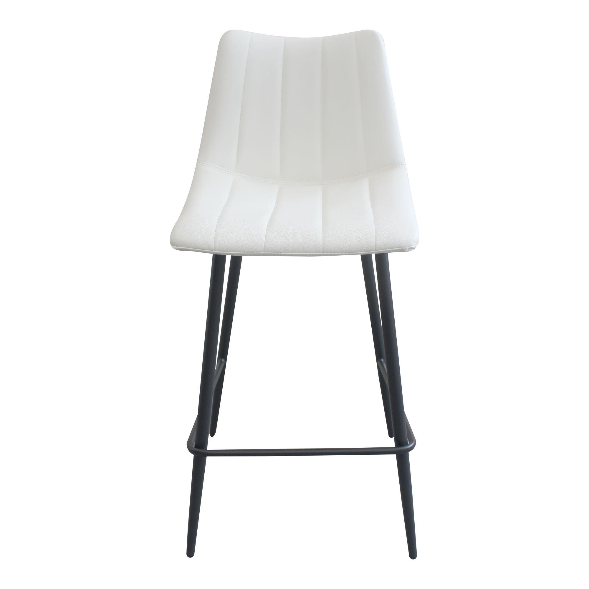 Contemporary modern counter stools get a new take with this sleek aesthetic. Available in several colors, the Alibi counter stool features striking vertical line stitches that add subtle detail to its monochromatic design. A soft vegan leather seat is shaped to fit for comfort so guests can relax at the island or bar counter.