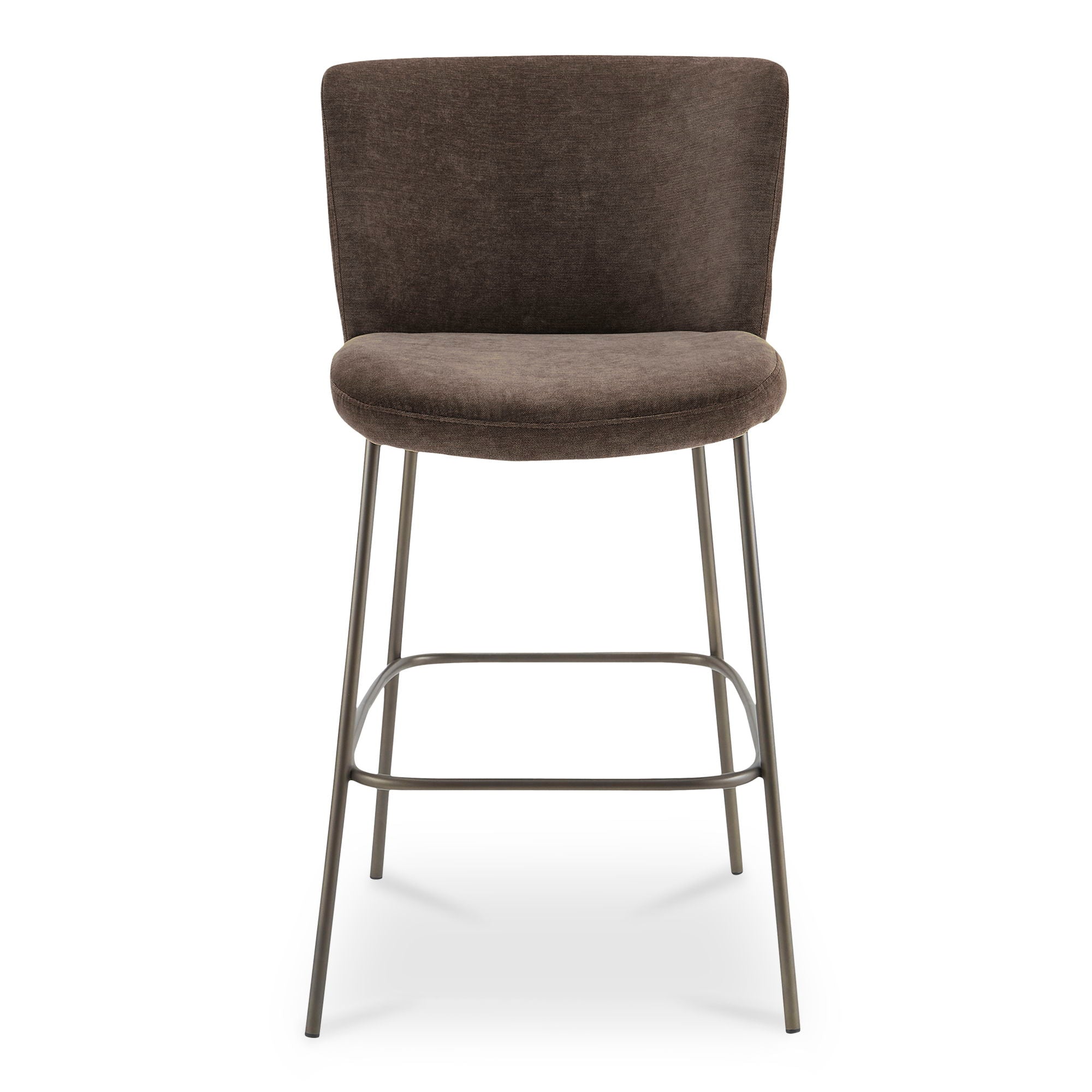 The Early bar stool is an elegant fusion of minimalist design and comfort that features a slim metal frame in a blackened bronze finish. Its seat and comfortably curved back are upholstered in soft fabric. It complements any dining setting, especially alongside wooden tables, presenting a clean, cohesive look that invites sophisticated ease.