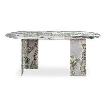 The Celia oval dining table effortlessly combines contemporary flair with a timeless silhouette. The table's allure is further enhanced by expressive green onyx marble, adding a touch of artistry and opulence. The smooth and organic textures on the marble beautifully contrast with the table's geometric base, creating an intriguing visual harmony and exuding an undeniable sense of elegance and versatility.