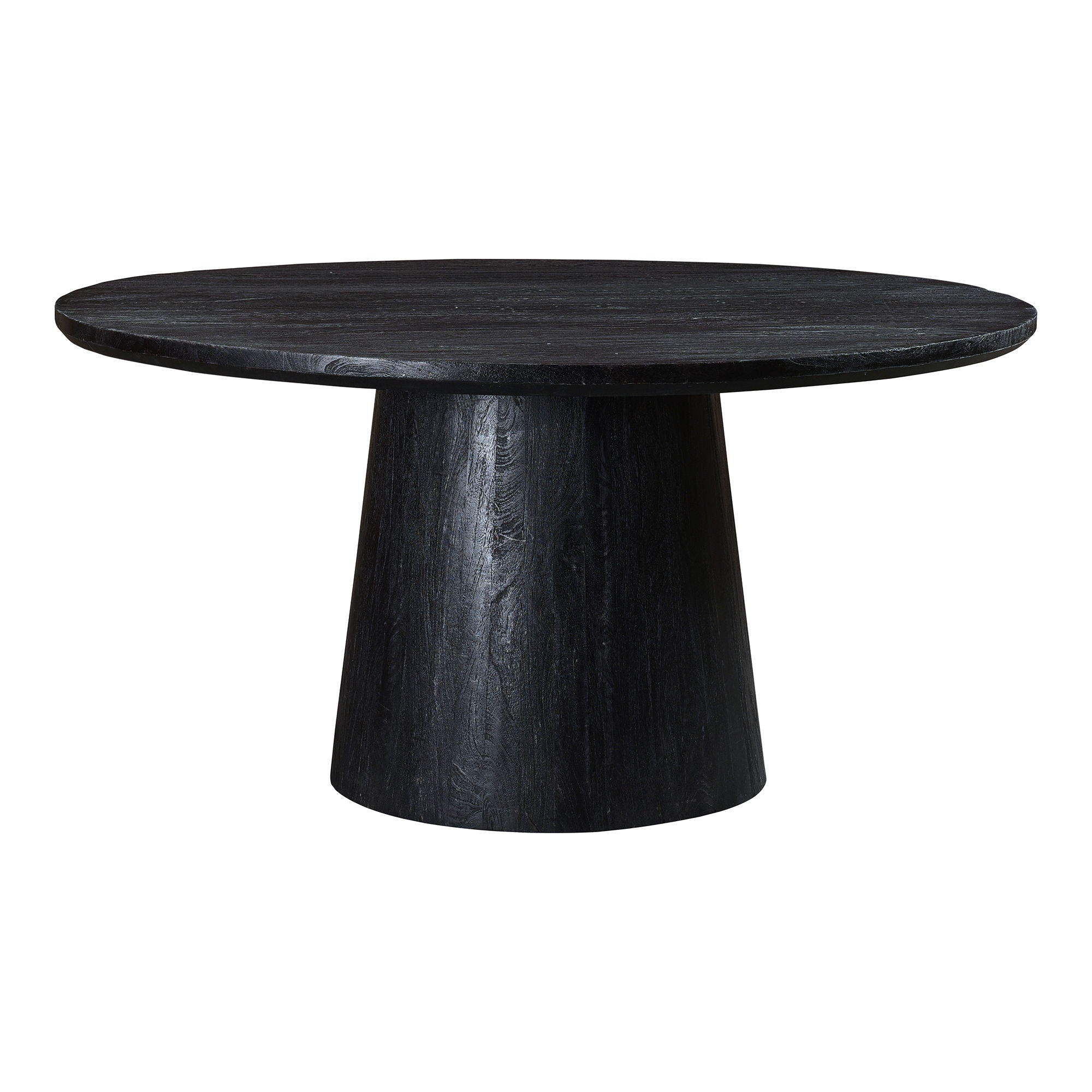 Bold in black with a sandblasted, cerused finish that accentuates the natural wood grain, the Cember dining table adds organic appeal and dramatic presence to any condo or smaller living space. A natural expression of modern rustic style, this piece features an oversized drum-shaped, tapered pedestal base, a solid foundation to a stately silhouette.