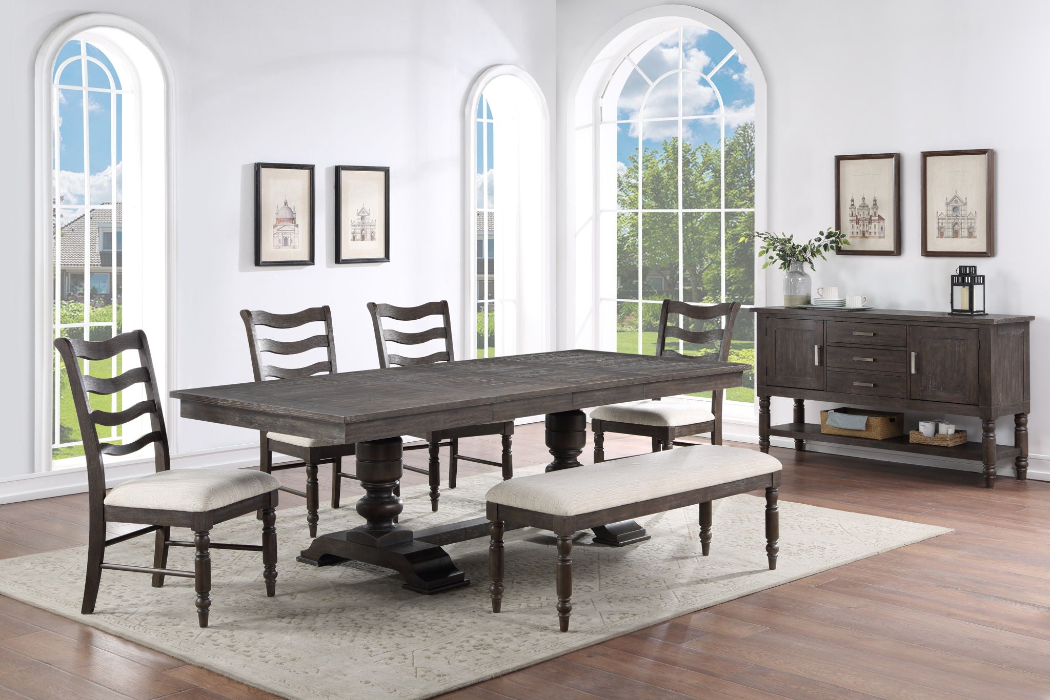 Classic styling with a modern twist, Hutchins offers large scale dining in a unique package. A dusty espresso finish offers neutral styling that combines with a traditionally shaped double pedestal table. Pair with the modern Ladderback Side Chair for a special dining collection.