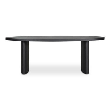 The William dining table showcases a contemporary silhouette with a rounded edge base and beautifully detailed herringbone pattern tabletop. The black stain finish adds a sense of maturity, complementing the captivating parquetry pattern on the exterior surfaces. A thick tabletop enhances the overall aesthetic appeal, underscoring the rustic pattern.