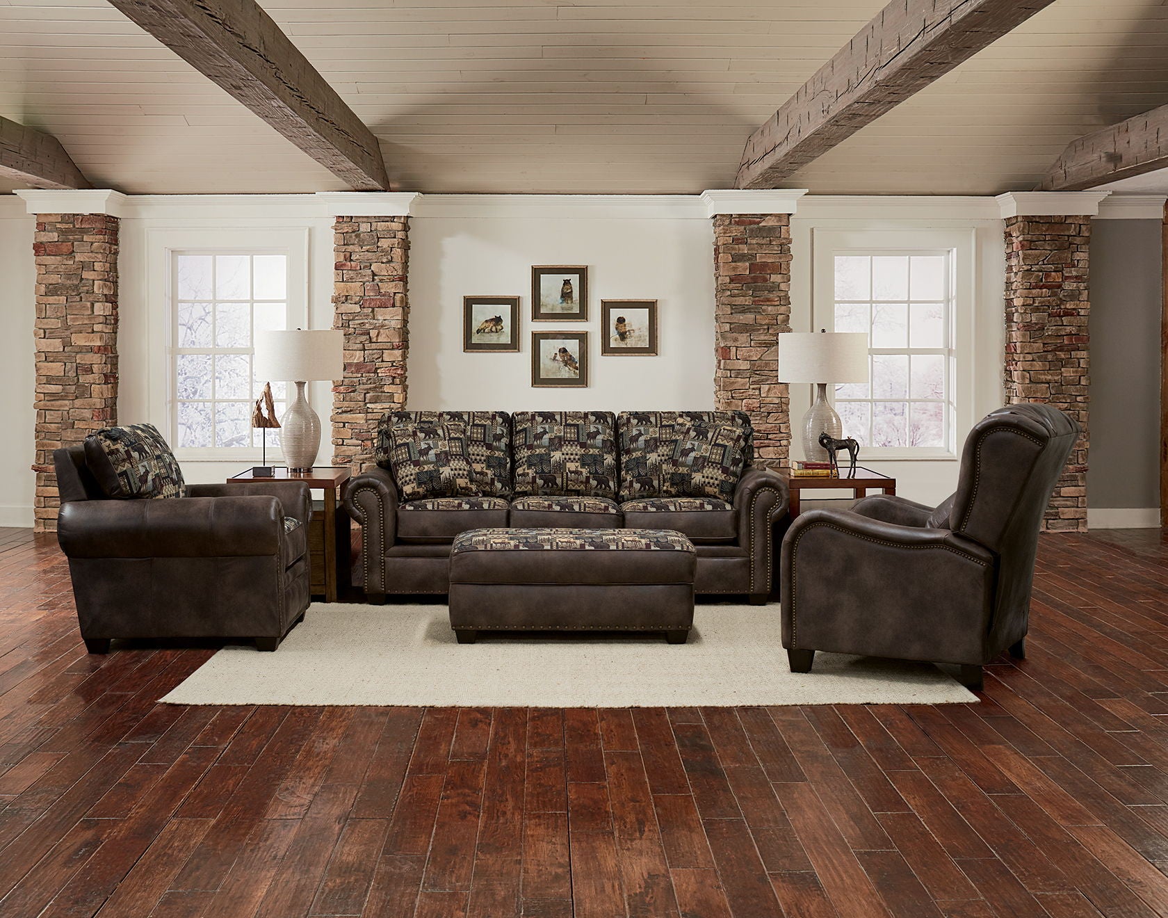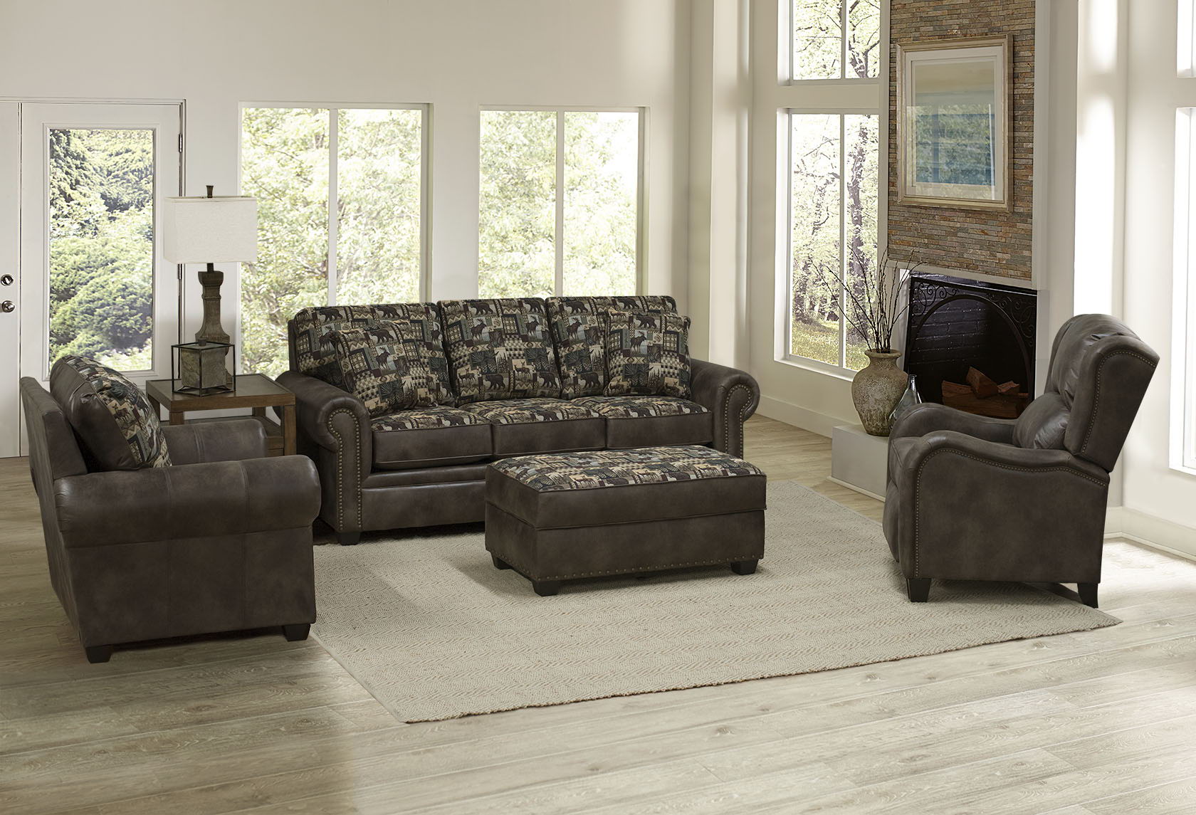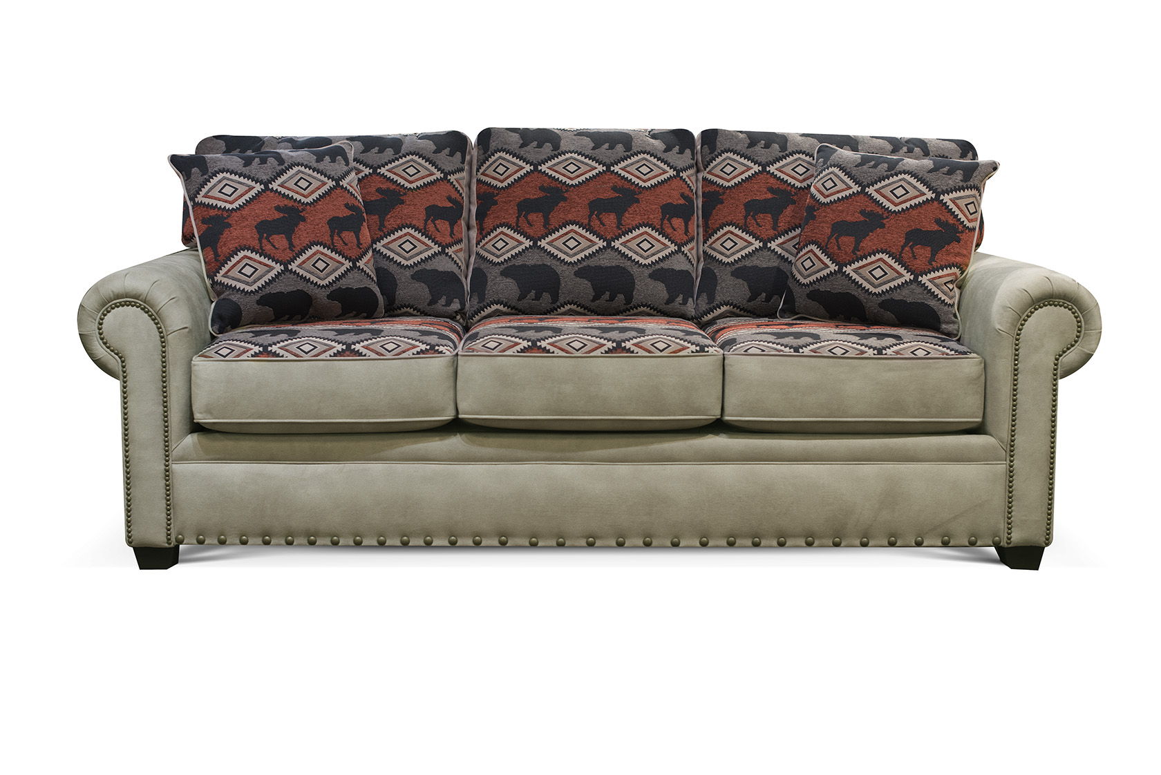 The lodge look is alive and well in our Jaden group. A three cushion style in married fabrics with pyramid legs and rolled and welted arms. Toss pillows are reversible. Novelty patterns combined with a leather-look fabrics provide the perfect choice for your cabin or retreat home. Available with or without brass nailhead trim. This collection includes a sofa, loveseat, chair, ottoman, storage ottoman, and queen sleeper.