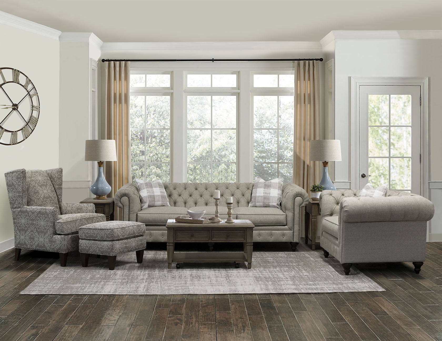 Our Rondell collection is our interpretation of the iconic English Chesterfield. This classic style features a beautifully tufted back and inside arm, simple front rail with button accents, a large rolled shelter arm accented with optional petite antique bronze nail heads, and an intricate turned wooden leg. We offer a sofa, love, chair, and ottoman covered in your choice of fabric or leather.
