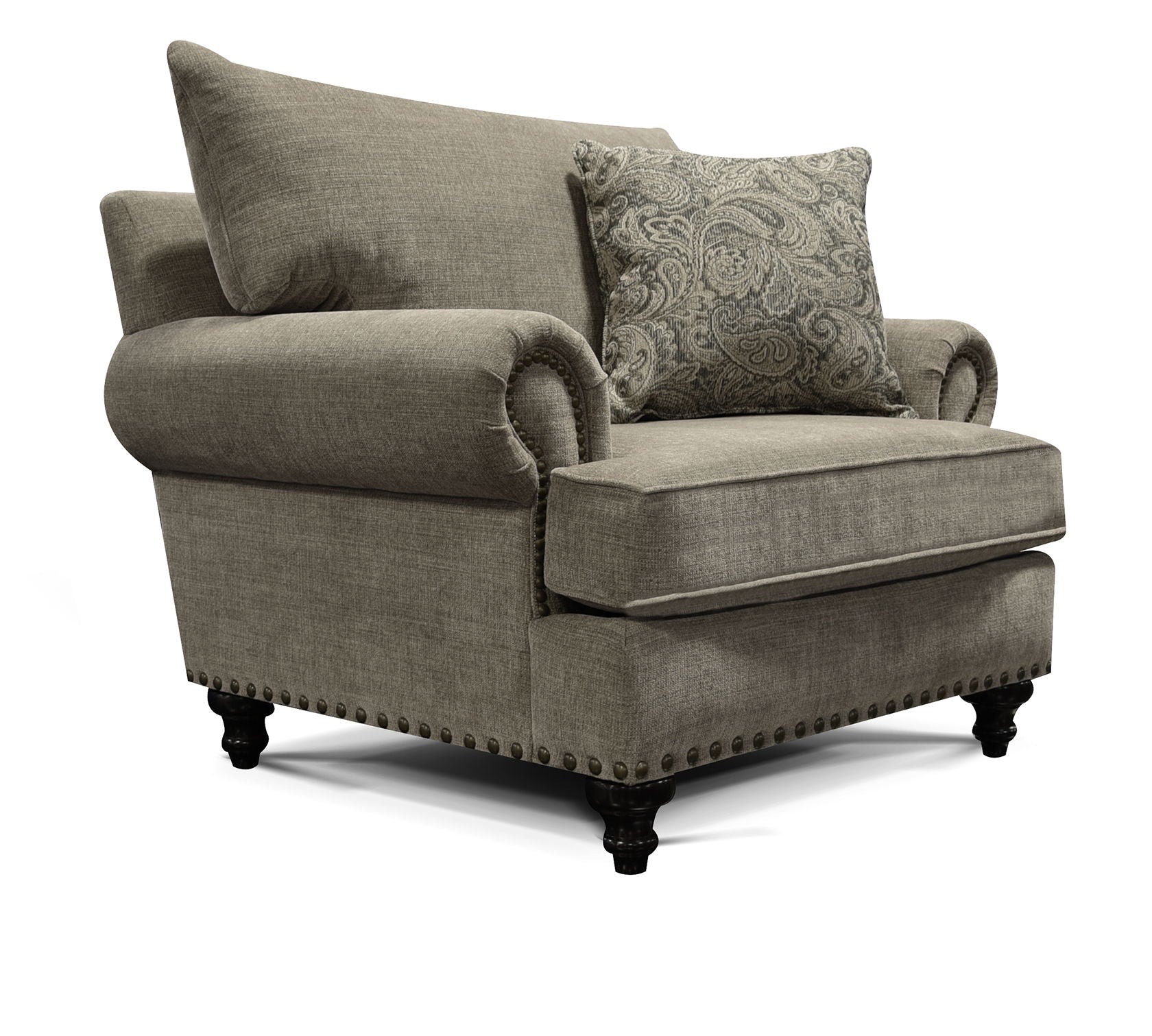 Create a welcoming atmosphere in your home with England's Rosalie collection. With its generous proportions, casual rolled arm, beautiful turned leg, optional antique brass nailhead trim, and loose pillow back, you'll probably want to sit and relax for a bit! Our Rosalie series features a sofa, loveseat, chair, ottoman, and sectional. Make this style go cottage or family room with your choice of over 400 fabrics!