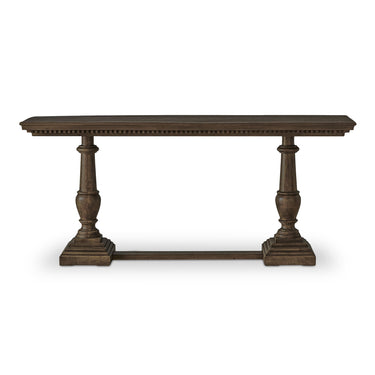 The Everson console table blends traditional elements with modern craftsmanship. Meticulously molded detailing and graceful leg profiles with a stretcher in between showcase its sophisticated design. Crafted from sustainable mango wood, the rich brown finish enhances the natural grain.