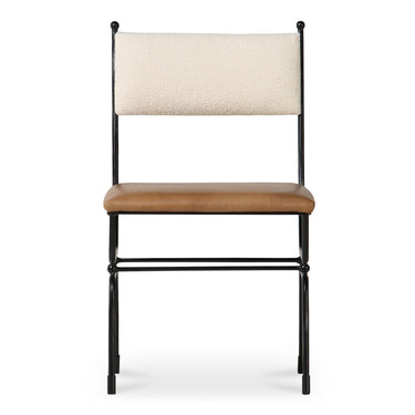 Gillian Segal for Moe's The Posta dining chair is inspired by the historical elegance of Italy's Posta Vecchia hotel, seamlessly marrying vintage allure with modern comfort. Its robust hammered metal frame underscores distinctive finial details on the back and base, echoing the Italian locale's enchanting spirit. Upholstered with top-grain brown leather seat and white textured fabric back, this piece adds plush comfort with a touch of Italian finesse.
