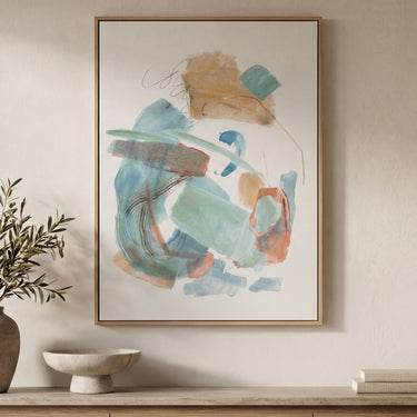 - Modern Minimal Mood: Layered blues and greens meet warm yellow and orange, balancing quiet structure with expressive scribbles for a gallery-ready focal point.