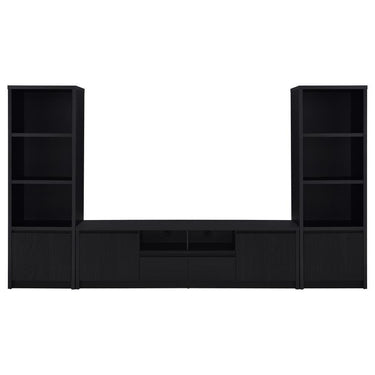 This modern entertainment center combines a sleek TV stand with two matching media towers, offering style and functionality. Finished in a bold black with a scratch-resistant eco-friendly laminate veneer, this unit provides ample storage and display options. The TV stand features cabinets, an open shelf with cable management, and a wide drawer, while each media tower includes open shelves and a bottom cabinet for organized storage. Perfect for creating a cohesive entertainment space in any living room.