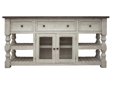 3 Drawer 2 Glass Door TV Stand. Exuding farmhouse chic with just the right touch of old-world charm, the Stone Collection is meticulously crafted from solid pine wood. The wood is lightly distressed, showcasing a white finish and complemented by weathered gray tops.