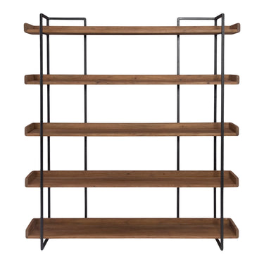 A sleek contemporary style constructed with an iron frame and solid acacia with a light brown stain.
