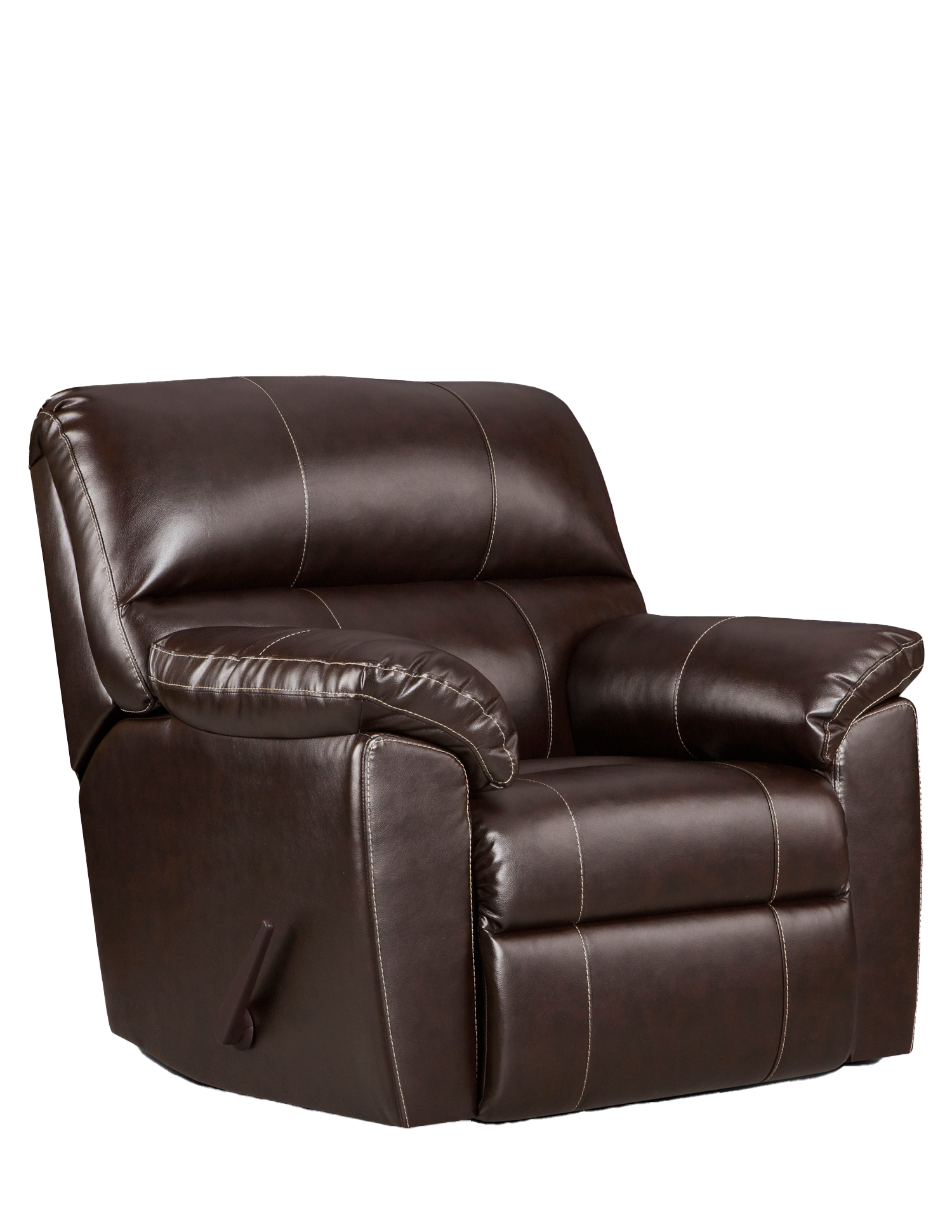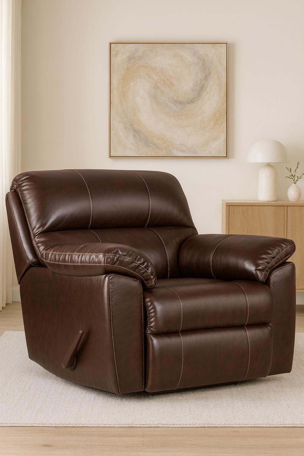 Sink into comfort that feels as good as it looks. The Austin Rocker Recliner brings rich dark-chocolate warmth and the timeless look of leather to your living space — without the high-maintenance fuss. Its overstuffed cushions invite you to kick back, raise your feet, and let the day melt away.