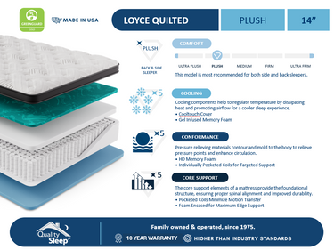Part of our exclusive Quality Sleep™ collection, the Loyce Quilted series blends cooling comfort, adaptive support, and lasting durability. Available in both Firm and Plush Euro Top, this 14” mattress is the perfect foundation for restful nights and refreshed mornings.