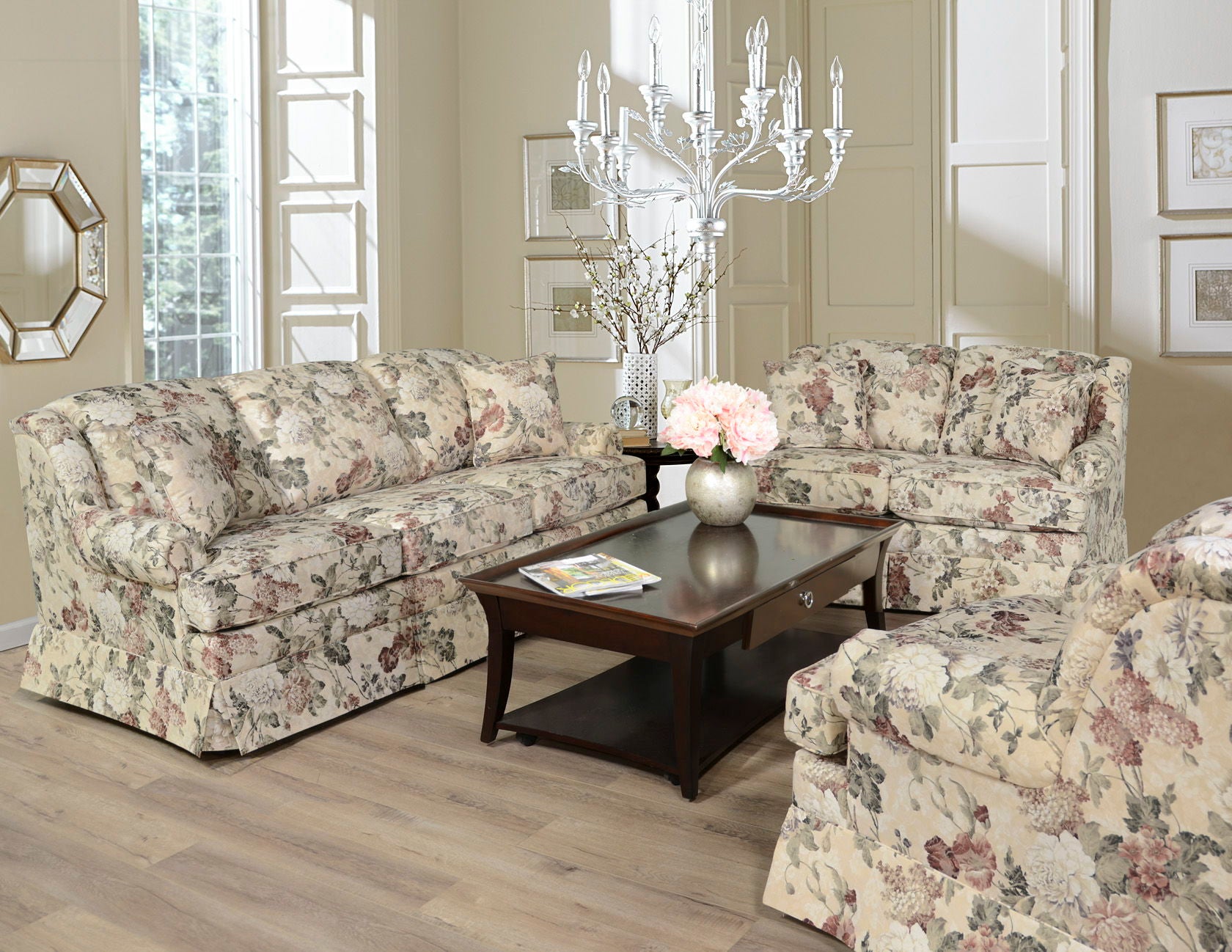 The upscale simplicity of the Rochelle collection is unsurpassed. Its petite scale, traditional skirt, and contrasting throw pillows make it just about perfect. This collection features a sofa, stationary and gliding loveseats, stationary and swivel gliding chairs, ottoman, and queen sleeper.