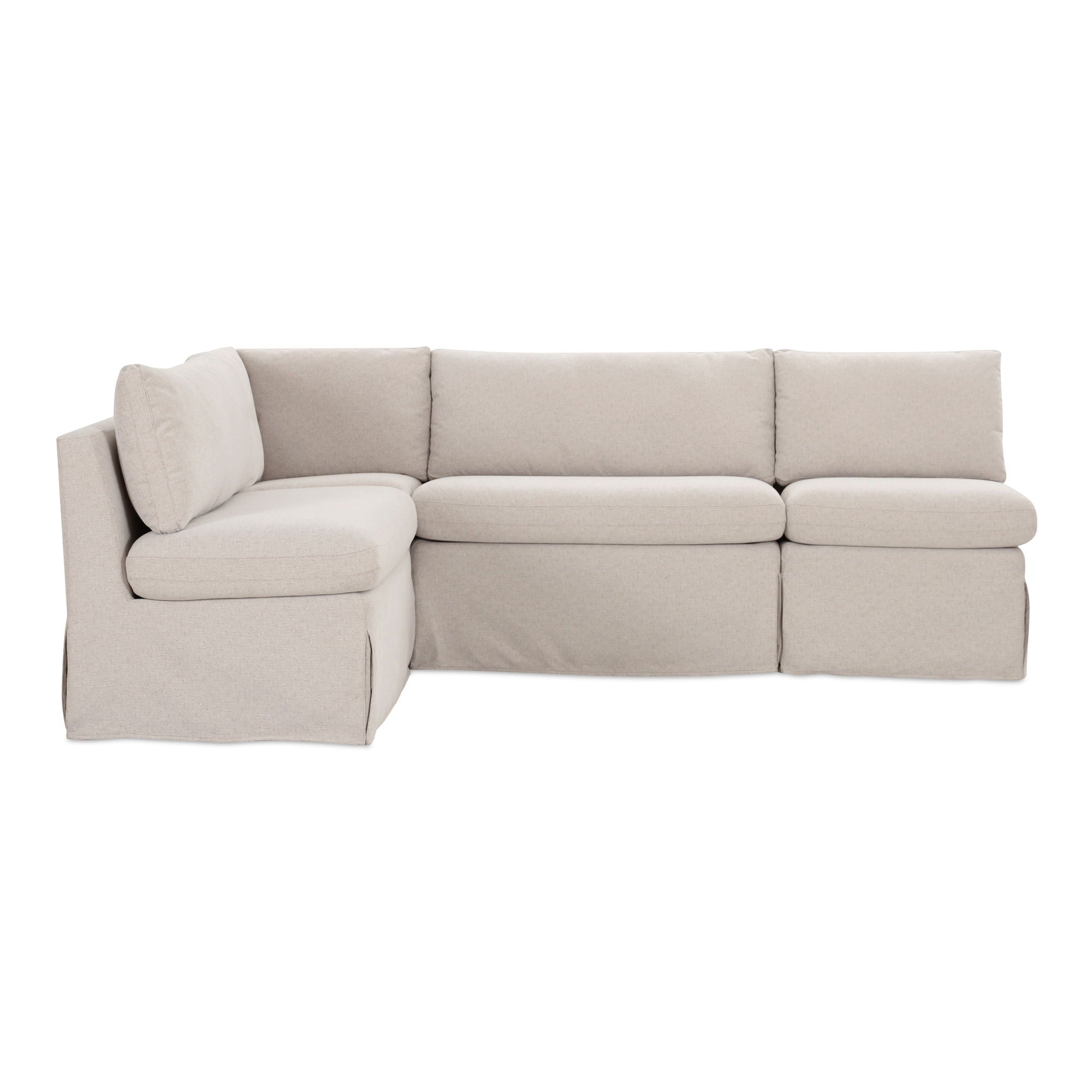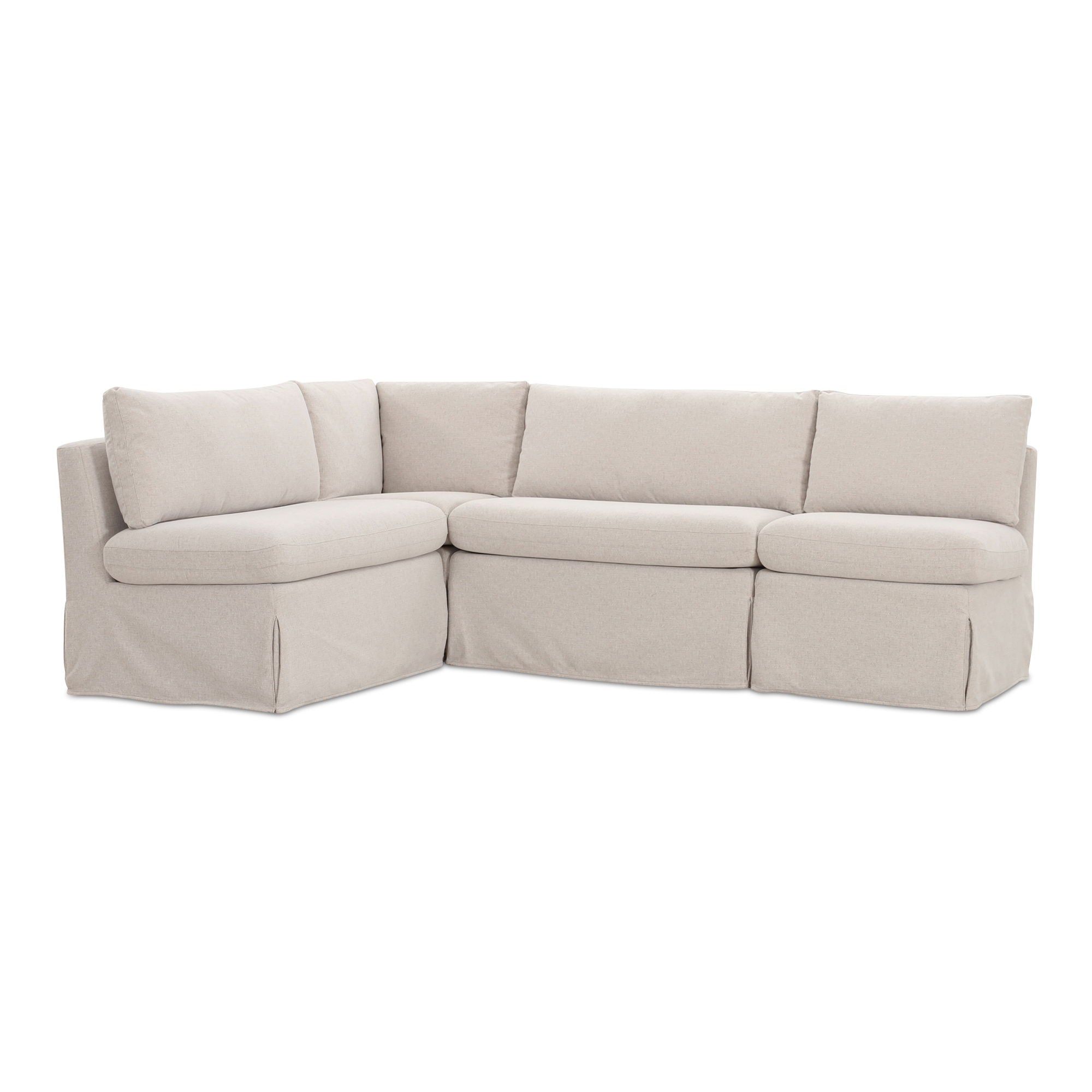 The Fable slipcover dining banquette L-shape's snug-fitting, washable slipcover with inverted pleats offers a tidy appearance and effortless upkeep. A slight tilt encourages a relaxed seating posture with a pillow back and seat cushions for comfort. Designed to be modular, it includes alligator clips to connect with other pieces in the collection, adapting seamlessly to various dining table sizes.