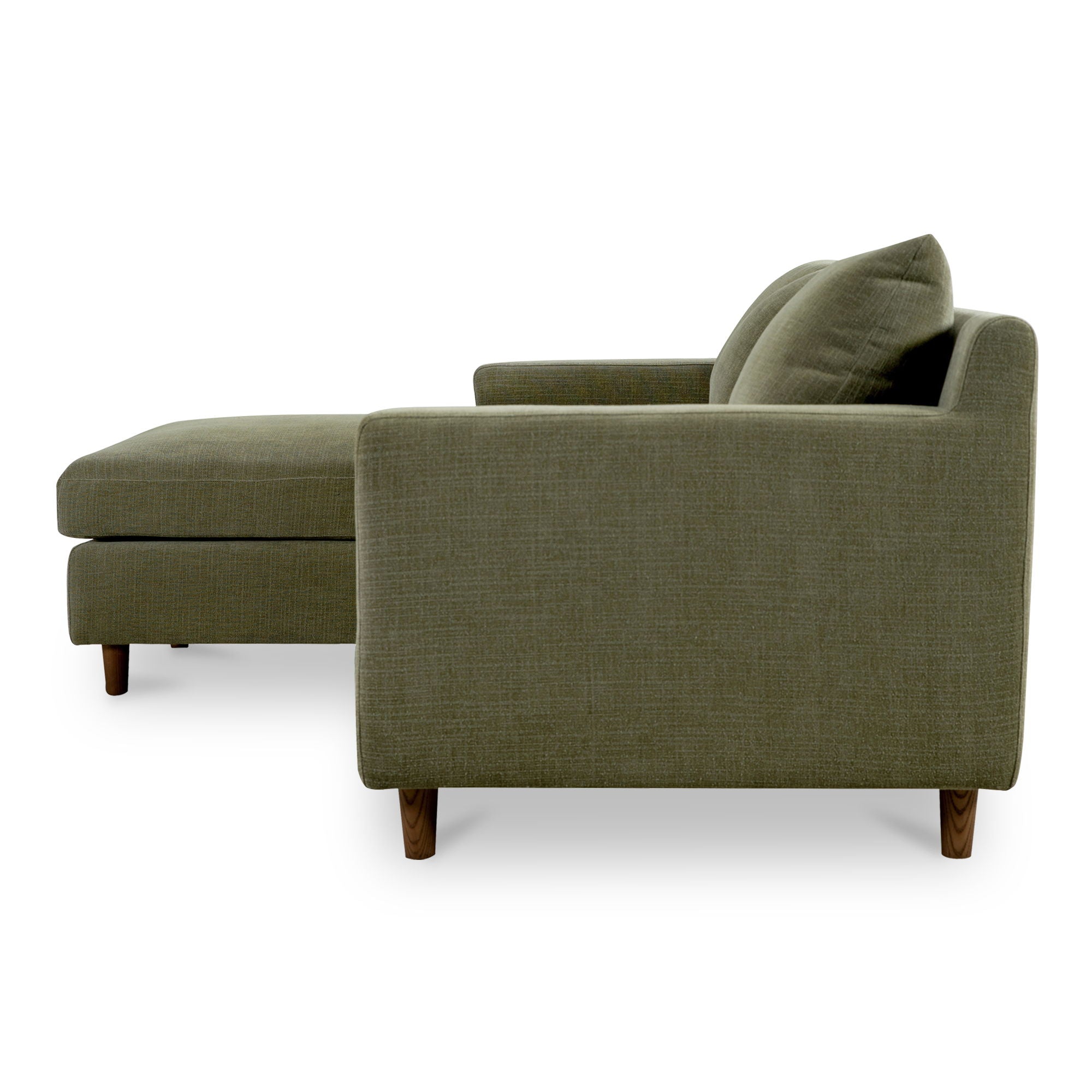 The Hutton sectional features soft-to-the-touch chenille fabric constructed from 100% polyester treated with C0 performance technology. A traditional higher back and tapered dark wood legs nod to mid-century aesthetics while providing contemporary coziness as a plush feather topper ensures unparalleled comfort.