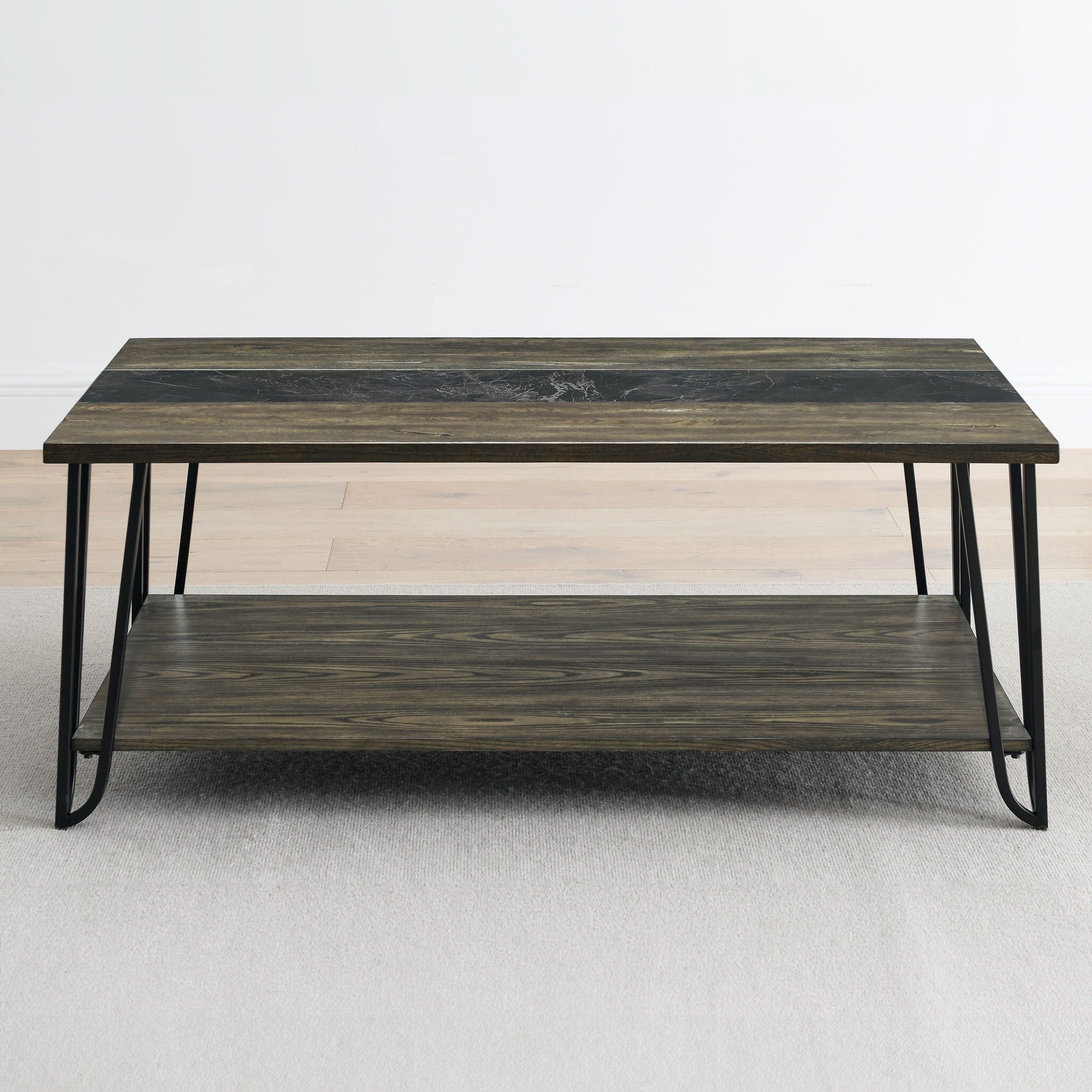 The Harper Cocktail Table, measuring 45 inches in length, is a masterful blend of casual rustic charm and mid-century modern elegance. Crafted with a distressed dark driftwood finish and a striking slate inlay, it’s a mixed-media gem that anchors any living space. Its canted loop iron legs add a touch of retro flair, while the bottom shelf offers ample space for display or storage. This table is an ideal centerpiece for a casual yet modern living room, offering both style and functionality.
