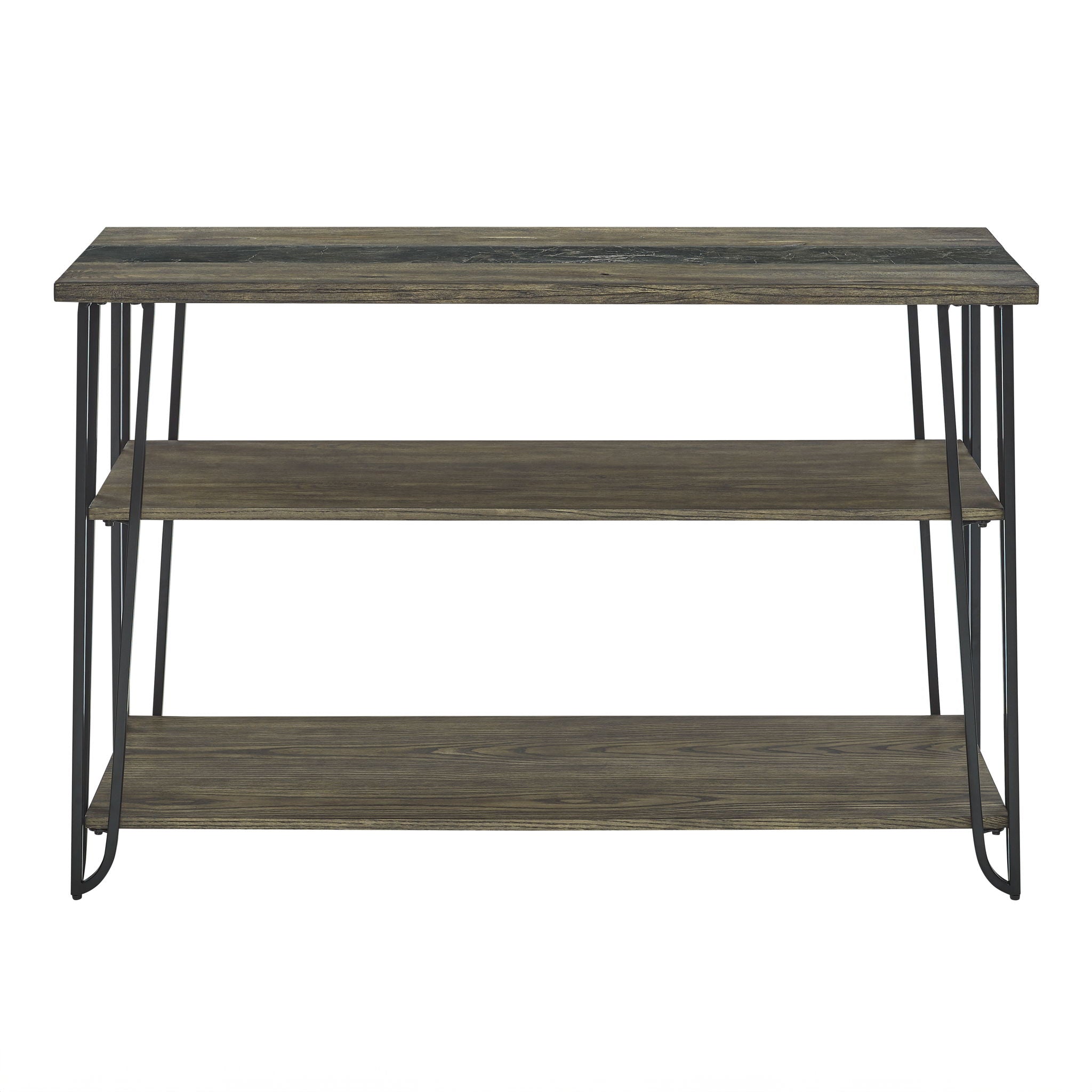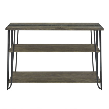 The Harper Sofa Table is a masterful blend of casual rustic charm and mid-century modern elegance. Crafted with ash veneers in a distressed dark driftwood finish and a striking sintered stone inlay, it’s a mixed-media gem that is the perfect behind the soft table, hallway hub or small entertainment unit. Its canted iron legs add a touch of retro flair, while a bottom and middle shelf offer ample space for display or storage. This table is an ideal centerpiece for a casual yet modern living room, offering both style and functionality.
