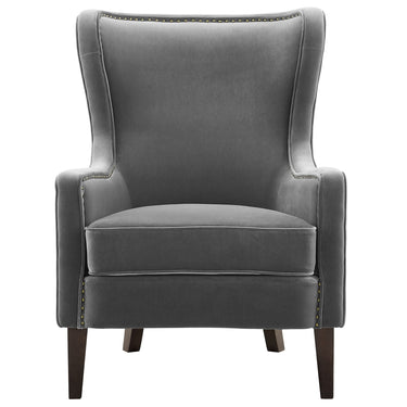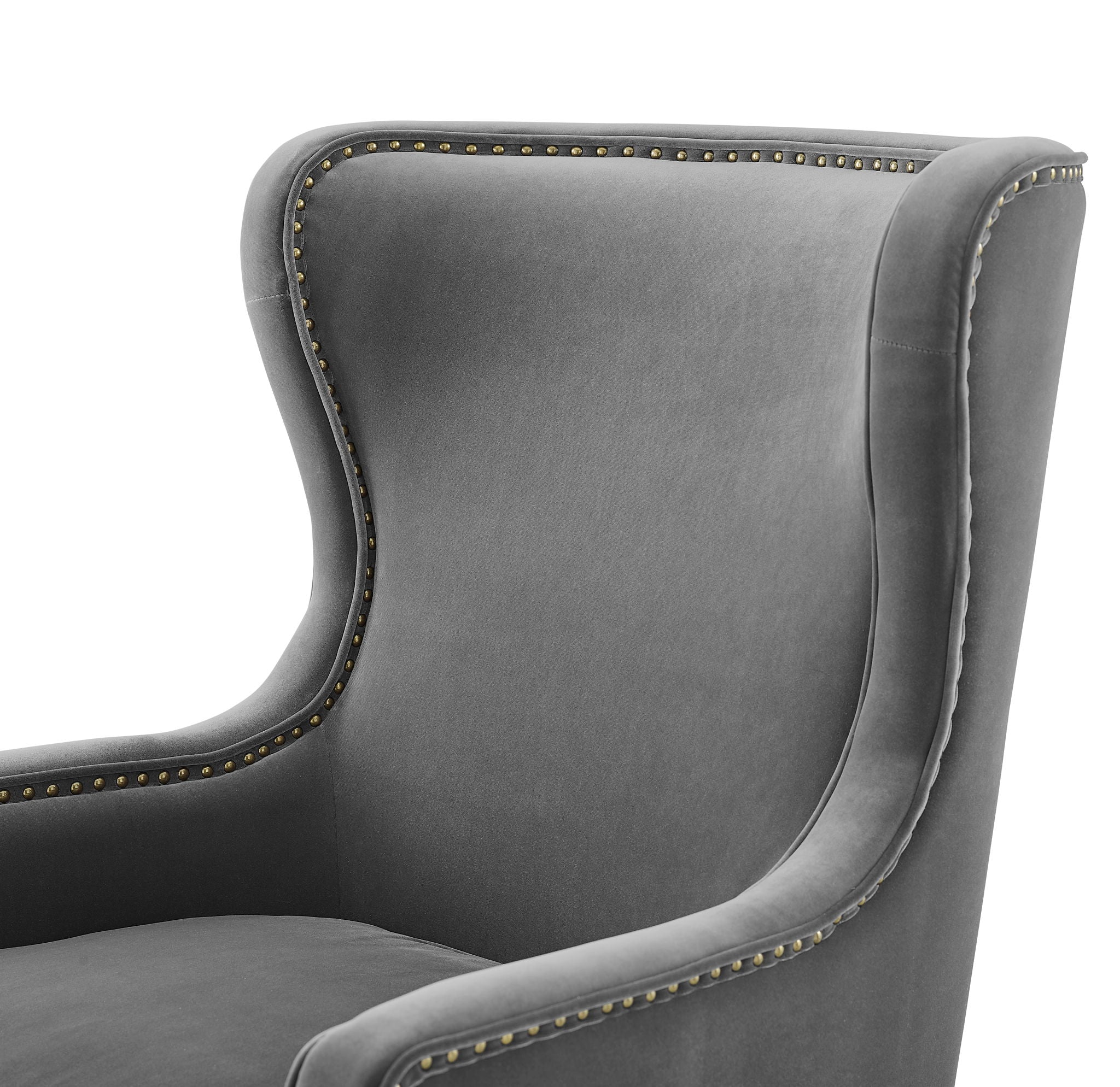 Rosco presents a modern take on classic wing-back chair styling. This silohouette comes in three colors each with a nailhead trim that matches the style of the chair. The charcoal velvet chair shown here features softly curved angles and brass nailhead trim that warms the profile up while lending a soft vintage accent to the chair. Tapered legs in finish complete the look.