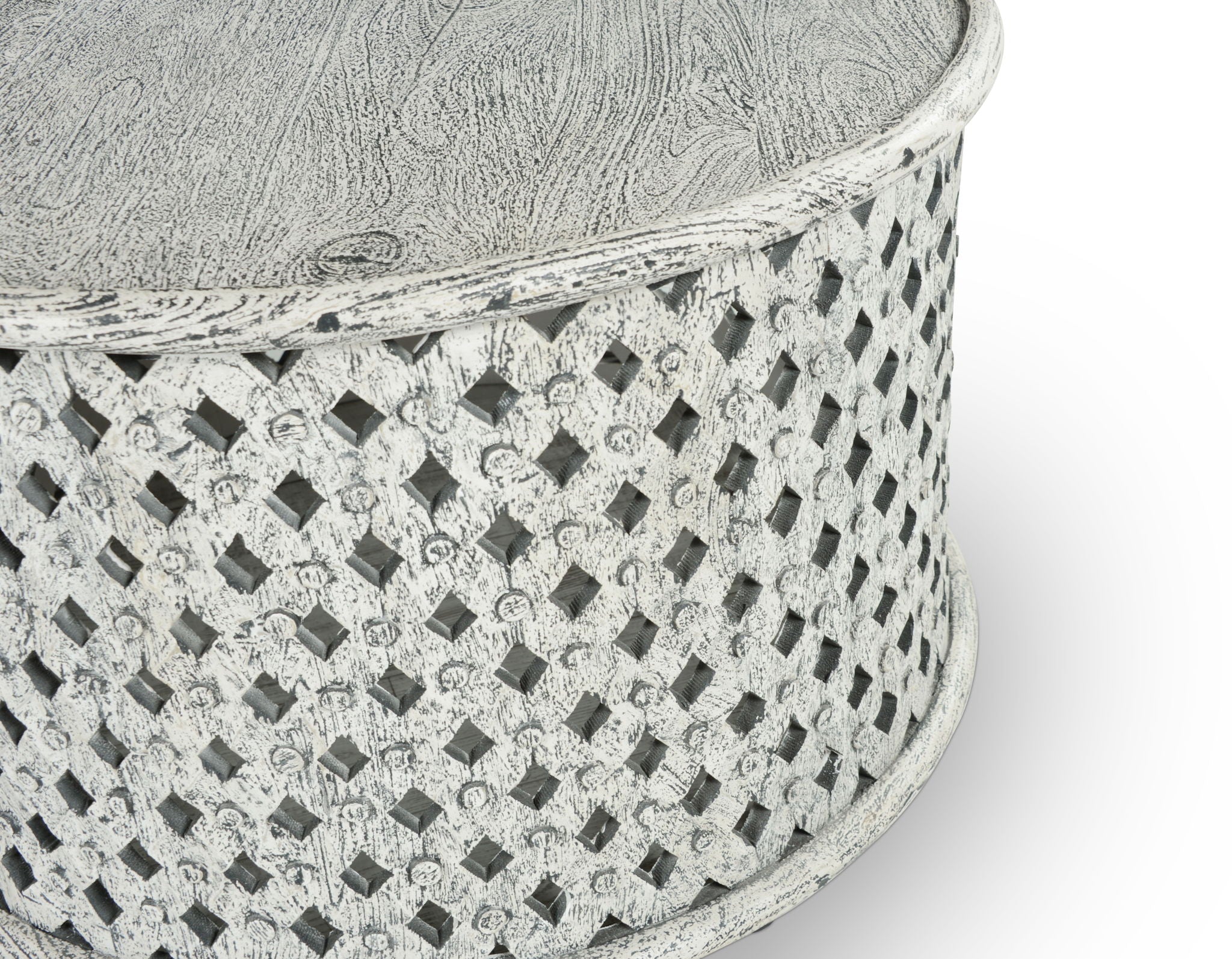 Hand-crafted wood-carved Cocktail Table in an aged alabaster finish, Samir features a transitional design that works whether your tastes are farmhouse or traditional. The round table dimensions fit well with Sectional Upholstery or Sofa Sets and feature a latticework base that adds interest to any room.