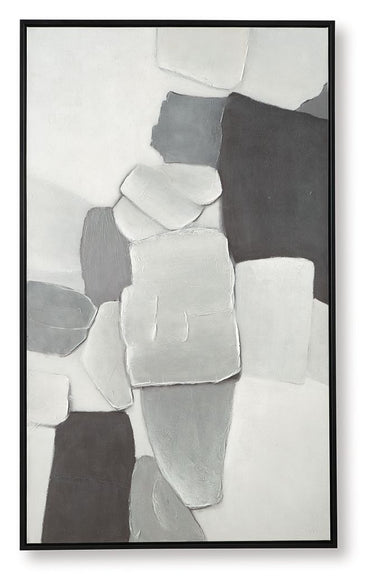 Handsomely made, this wall art takes an abstract approach to contemporary stylings. Its neutral hues make a solo statement or act as a grounding centerpiece to a gallery wall—perfect for pairing alongside muted tones or vibrant colors alike. Hand-painted embellishments and a sleek black frame provide added refinement.