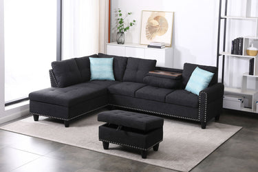 Elevate your living space with our Sectional Set, featuring an L-shaped design perfect for space-conscious homes. The modern look is achieved through a manufactured wood frame and low-profile dowel legs, wrapped in a versatile linen blend fabric. Enjoy ample support with foam-filled cushions, while the rounded arms, nailhead trim, and subtle tufting add a touch of tradition we adore. The set includes a storage ottoman and two toss pillows, offering both comfort and style for a complete lounging experience.
