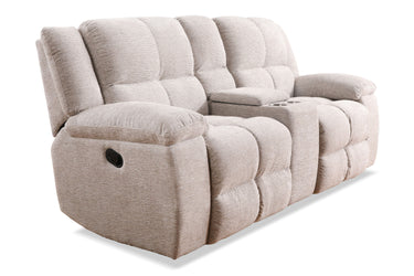 Big and cozy, but make it fancy! The Buster Dual Reclining Console Loveseat does just that. Exaggeratedly large plush cushions and dual manual reclining mechanisms create oversized lounging space that just beckon you to take a load off. The luxurious buff cover is made from high-grade performance cover, giving it a hand to die for that is also easy to clean. Cup holders inside each sofa arm create function without affecting form as they conveniently hide away when not in use. with looks, feels and features like these, it is clear that the Buster Dual Reclining Console Loveseat is and exceptional value-driven solution to relaxation needs.