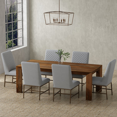 Crafted from solid mango, this table boasts a unique aesthetic with natural variations of color, wood grain, and knots. The geometric mitered edge creates a seamless transition between the table top, apron, and angled legs, and is generously proportioned to comfortably seat up to eight guests. The bold, simple silhouette features sleek angular details for distinctive beauty, making it the perfect addition to any home. Handcrafted by artisans, each table is a true work of art that will add authentic global-inspired character to your home. Exquisitely finished by hand, this table is sanded, stained, and sealed with a lacquer top coat, ensuring a durable and long-lasting surface. The wood is kiln-dried to minimize warping and splitting, ensuring that this table will be a beloved piece in your home for years to come. Entertain in style with the 86 Inch Rectangular Table.