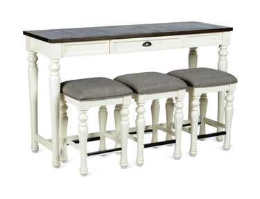 Add instant stadium seating to your living room with the 4-piece Joanna Sofa Bar Set. This set includes Sofa table and three stools that can be placed behind a Sofa, in a hall or in a compact dining area to give instant extra seating to family and guests. The Sofa Bar works great as an accessory piece in an open floor plan or as an extra desk. The two-tone ivory and mocha finish and farmhouse design work well with many of today's casual styles and the piece can be used alone or paired with the many pieces in the burgeoning Joanna occasional and dining collection.