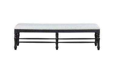 Featuring a sleek black finish over solid Asian hardwoods, the Odessa Bench is a modern interpretation of a classic farmhouse style. The 65.5-inch bench is made from solid Asian hardwoods and can accommodate three adults comfortably., ts solid wood turned legs, generously supported with stretchers to ensure stability and longevity. The fully cushioned seat, adorned with easy-care white polyester fabric, offers both comfort and a striking black-and-white contrast, adding a contemporary touch to your decor. Accent your home with the timeless elegance of the Odessa Bench, where tradition meets the present.