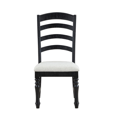 Elegantly sophisticated, this black and white farmhouse chair is a modern interpretation of the classic farmhouse chair.The Odessa Side Chair features an intricate ladderback design and elegantly turned legs crafted from distressed Asian hardwoods. Generous 3-inch cushioned seat ensures long gatherings are comfortable without compromising style. With its easy-care polyester fabric, this chair proves that you can have it all – a chair that looks as good as it feels.