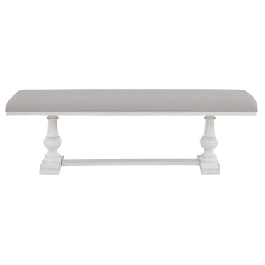A solid wood base with intricate, substantial turnings are just the beginning of the details found in the Warren 60" Upholstered Bench. The style feels timeless yet modern, with a fresh distressed white finish that updates its classic form. A 3" seat cushioned with 1.8 density foam ensures comfortable seating for up to three while the polyester covering with a linen-like appearance means you won't need to worry nearly as much about upkeep and wear and tear. Flexibility seating for adults or children, this bench is sure to fit the bill in a bedroom, hallway or dining area.