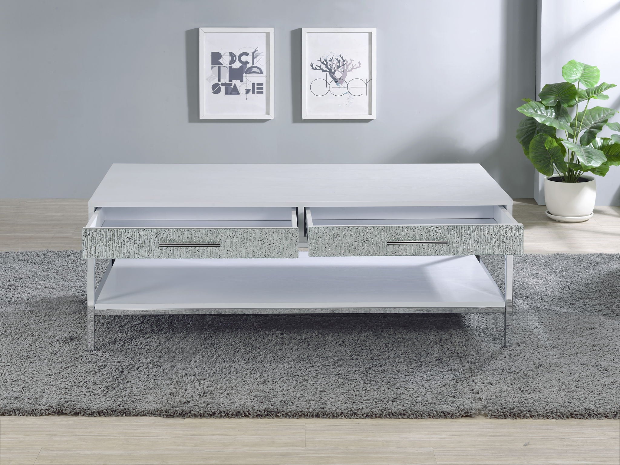 Contemporary glam styling in a beautiful centerpiece to a living room. Mirage combines a white finish with mirrored drawer fronts and chrome legs in a dazzling table that will sparkle with the available light. Function is also important and the Mirage Coffee Table has two drawers and a bottom shelf to help keep everything organized.