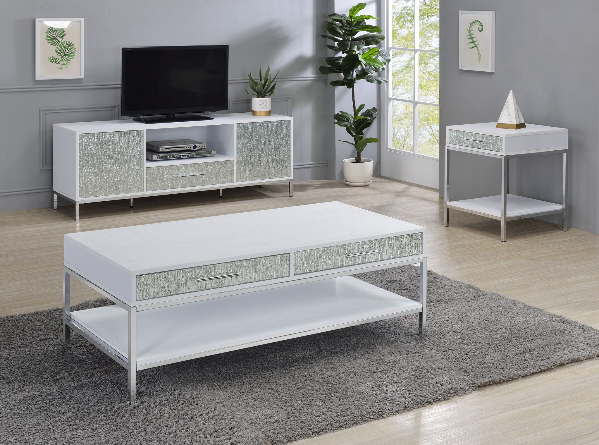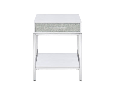 Dazzle your living area with the glitz and sparkle of the Mirage Side Table. Combining a white finish with mirrored drawer fronts and chrome legs produces a table that will catch attention as it sparkles with the available light. Function is also important and the Mirage End Table has two drawers and a bottom shelf to help keep everything organized. Whether as a Side Table in a den or as a Nightstand in the Bedroom, the Mirage Side Table is sure to please.