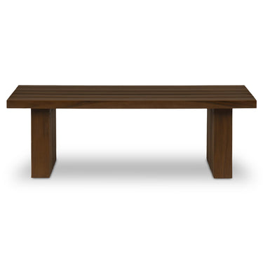 Lightweight look, laid-back feel. Denby keeps things lifted with an open frame and laid-back feel. A slatted teak top lets light and air move through, while square post legs ground the silhouette. Finished in a warm, toasted tone, it adds natural texture to any setup. Simple, solid, and built to live easy—indoors or out.
