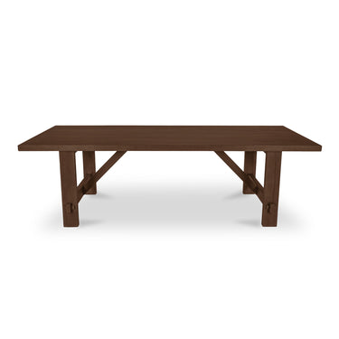 The Edmond outdoor dining table brings timeless elegance to al fresco dining. This FSC-certified solid teak table features a slatted top with stretchers and joinery detailing, evoking a traditional aesthetic with a touch of sophistication. The brown finish adds warmth, while its durable and weather-resistant construction makes it the perfect centerpiece for the patio or garden.
