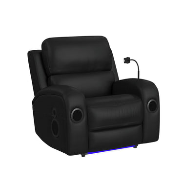 Experience ultimate relaxation with the Euphora Power Glider Recliner. Designed for comfort, it features heat massage, wireless charging, built-in speakers, and an adjustable mobile device holder. The power headrest, recline, and lumbar support help you find the perfect position to unwind for hours. A metal cupholder and storage area is concealed on the chair's side, allowing you to keep your essentials comfortably within reach, while LED lighting adds bold, modern flair. For a chair as sleek as it is cozy, the Euphora Power Glider Recliner is unmatched in style and comfort.