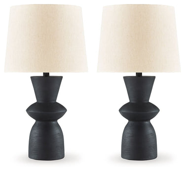 Turn on the brilliance and modern flair of this table lamp set. The angular silhouette and intriguing base in distressed black are the definition of bold style. These lamps pair wonderfully with contemporary furniture.
