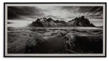 If you have your sights set on a striking landscape, this wall art is a natural wonder. Staggeringly beautiful, the framed black and white print showcases majestic mountains and a meandering stream. This moody and marvelous piece adds an air of dramatic beauty to your modern decor.